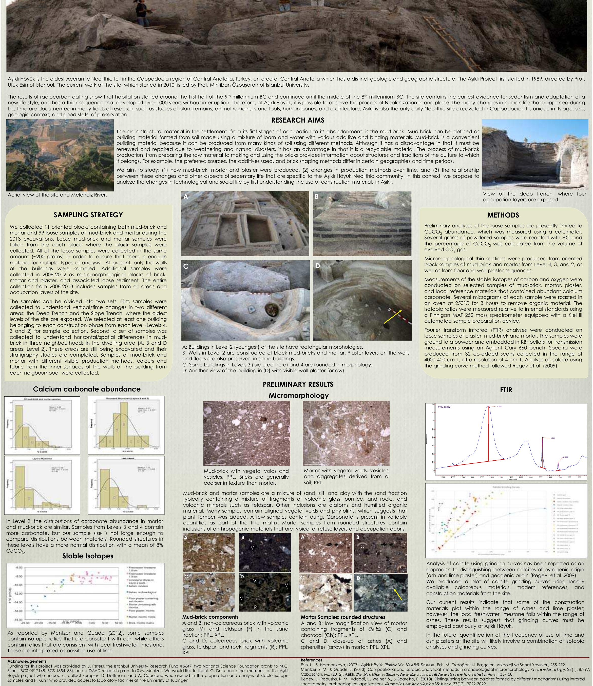 Aşıklı Höyük is the oldest Aceramic Neolithic tell in the Cappadocia region of Central Anatolia, ... more Aşıklı Höyük is the oldest Aceramic Neolithic tell in the Cappadocia region of Central Anatolia, Turkey, an area of Central Anatolia which has a distinct geologic and geographic structure. The Aşıklı Project first started in 1989, directed by Prof. Ufuk Esin of Istanbul. The current work at the site, which started in 2010, is led by Prof. Mihriban Özbaşaran of Istanbul University. The results of radiocarbon dating show that habitation started around the first half of the 9 th millennium BC and continued until the middle of the 8 th millennium BC. The site contains the earliest evidence for sedentism and adaptation of a new life style, and has a thick sequence that developed over 1000 years without interruption. Therefore, at Aşıklı Höyük, it is possible to observe the process of Neolithization in one place. The many changes in human life that happened during this time are documented in many fields of research, such as studies of plant remains, animal remains, stone tools, human bones, and architecture. Aşıklı is also the only early Neolithic site excavated in Cappadocia, It is unique in its age, size, geologic context, and good state of preservation. RESEARCH AIMS The main structural material in the settlement-from its first stages of occupation to its abandonment-is the mud-brick. Mud-brick can be defined as building material formed from soil made using a mixture of loam and water with various additive and binding materials. Mud-brick is a convenient building material because it can be produced from many kinds of soil using different methods. Although it has a disadvantage in that it must be renewed and repaired due to weathering and natural disasters, it has an advantage in that it is a recyclable material. The process of mud-brick production, from preparing the raw material to making and using the bricks provides information about structures and traditions of the culture to which it belongs. For example, the preferred sources, the additives used, and brick shaping methods differ in certain geographies and time periods. We aim to study: (1) how mud-brick, mortar and plaster were produced, (2) changes in production methods over time, and (3) the relationship between these changes and other aspects of sedentary life that are specific to the Aşıklı Höyük Neolithic community. In this context, we propose to analyze the changes in technological and social life by first understanding the use of construction materials in Aşıklı.