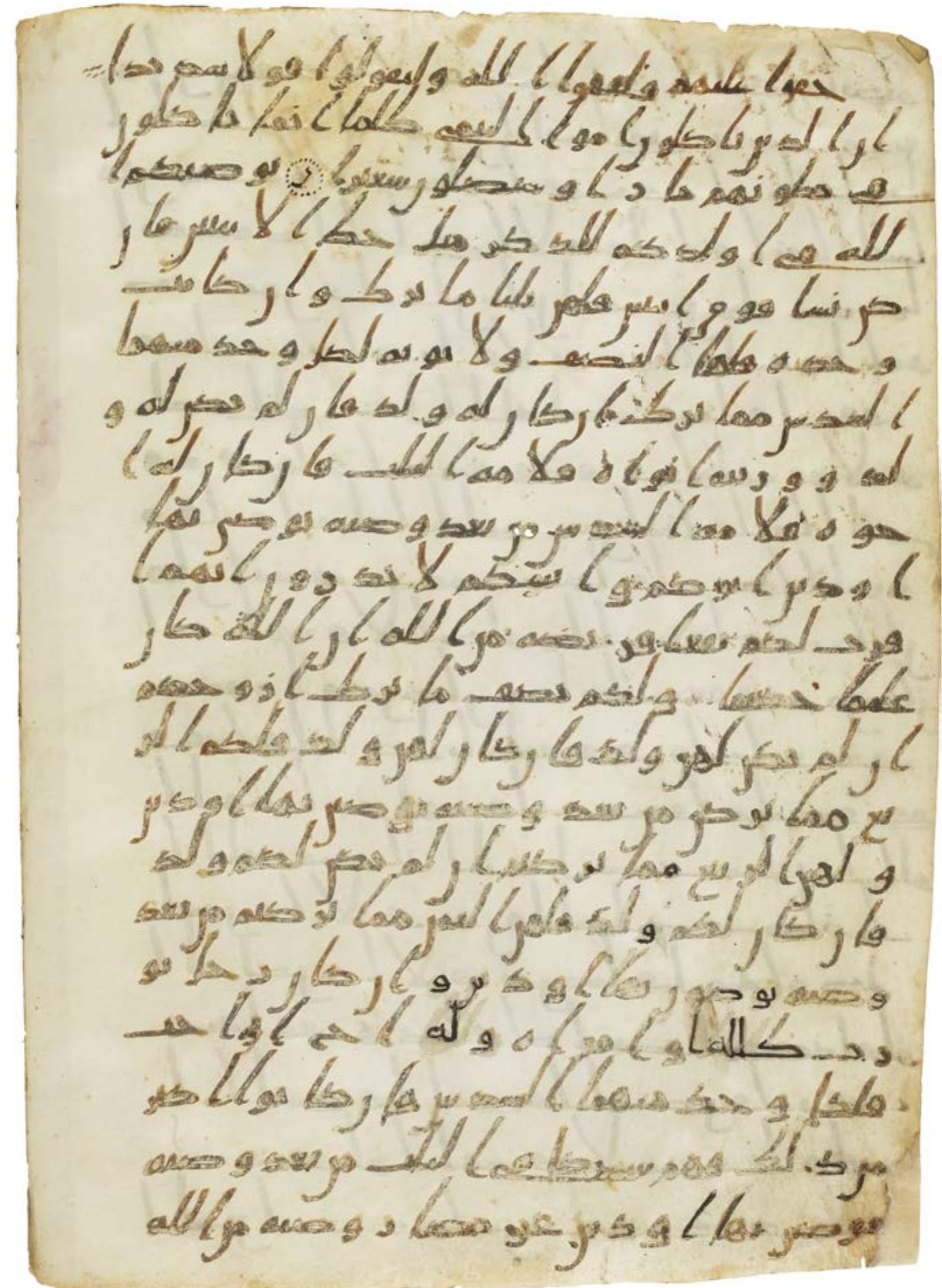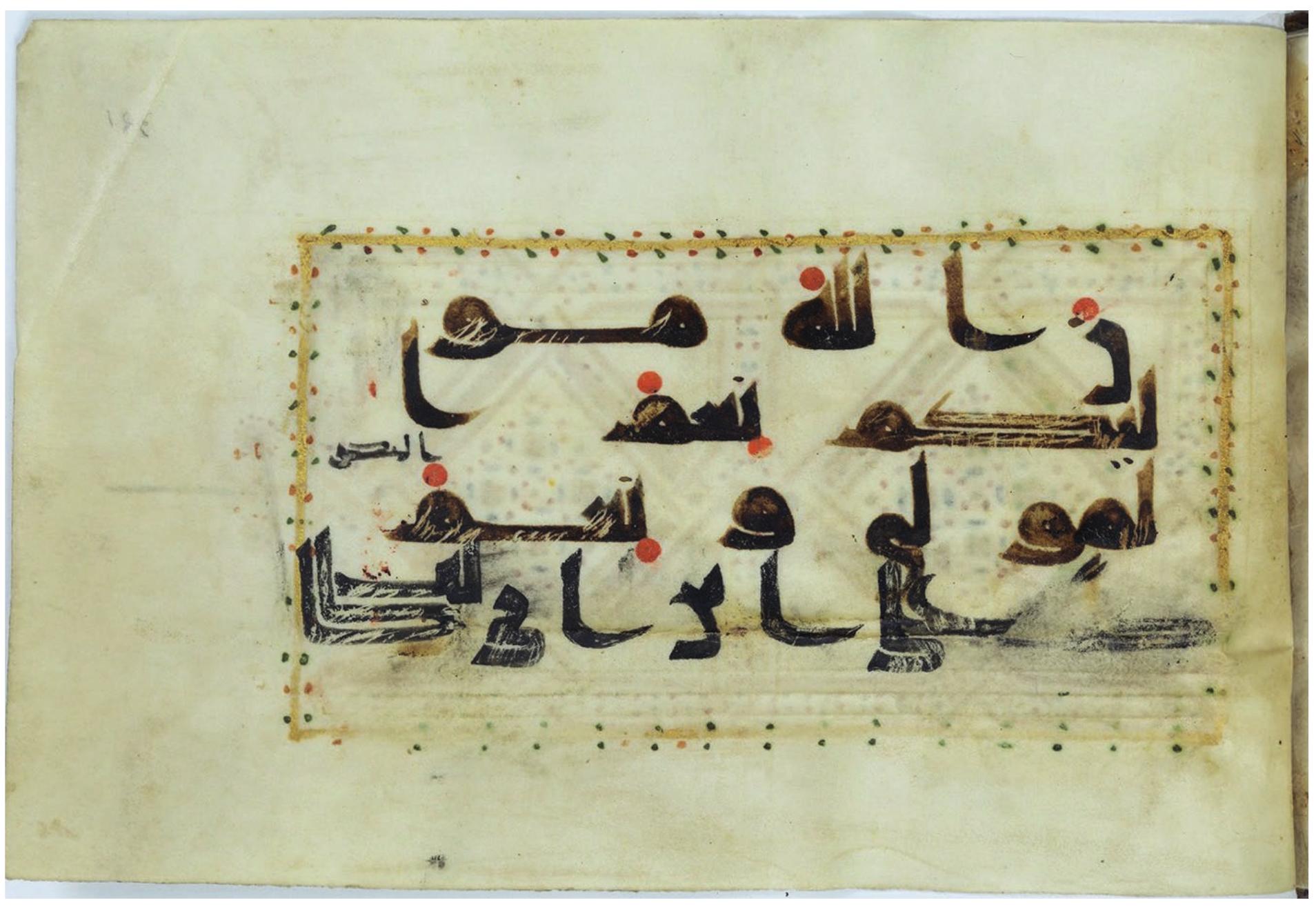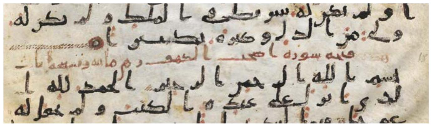 Two Folios from an Umayyad Qur'an Manuscript Single Folio from an Umayyad Qur'an Manuscript Sura ... more Two Folios from an Umayyad Qur'an Manuscript Single Folio from an Umayyad Qur'an Manuscript Sura Ta-ha, verses 126-134 (recto); Sura Ta-ha, verses 134-135 to Sura al-Anbiya' (The Prophets), verses 1-7 (verso); West Asia or North Africa; Umayyad period, c. 2nd century AH/c. 8th century CE