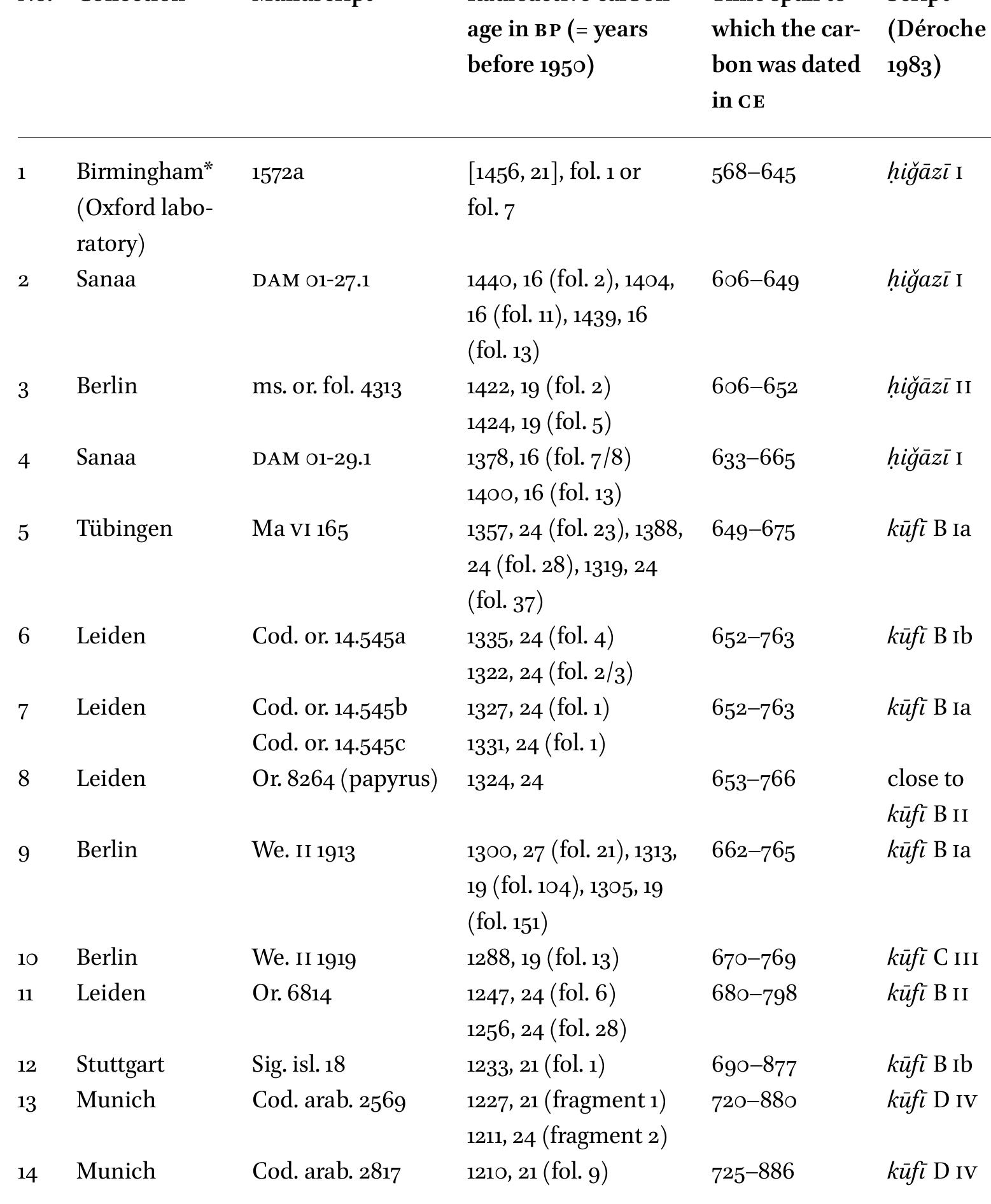 "This paper presents the carbon dating results of seven Qurʾān manuscripts and one Syriac Bible (... more "This paper presents the carbon dating results of seven Qurʾān manuscripts and one Syriac Bible (Peshitta) of the National Museum of Iran (NMI) in the context of palaeography of early Qurʾān manuscripts. The carbon age measurements, for the first time obtained from a collection in the Eastern lands of Islam, include results from one manuscript in script style kūfī B, one in kūfī C, and five in kūfī D. Measurements from carbon analysis of the Qurʾāns of the National Museum confirm the relative chronology of script styles in Qurʾānic palaeography. Obtained measurements from the Qurʾāns of NMI, however, give evidence for an early dating of kūfī D script styles. For the intricate question of date, carbon dating provides essential anchor points in chronology, beneficial for a historical understanding of Qurʾāns specifically and manuscripts in general, as the carbon date results of the Syriac Bible of NMI show. Scientific dating is recommended for producing comprehensive catalogues of manuscript collections as it reveals a new perception of Qurʾānic palaeography where chronology remains unexplored."