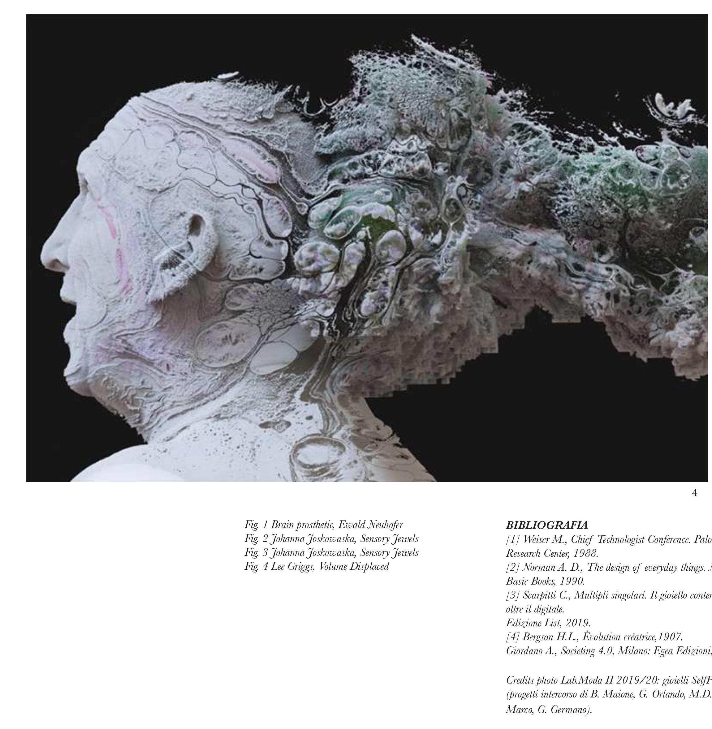 In the formulation of a plausible paradigm of a post-digital poetics, the investigation on the re... more In the formulation of a plausible paradigm of a post-digital poetics, the investigation on the relationship between design and technology confirms their progressive fusion towards a growing symbiotic relationship in which, as Mark Weiser already proposed with his Ubiquitous Computing1, one is destined to enhance the characteristics of the other. Within the research of the Valere Program of the Università della Campania “Luigi Vanvitelli” related to the theme of post-digital manufacturing processes, we intend to investigate the application of advanced technologies that act on the intersection between design, technology and body.