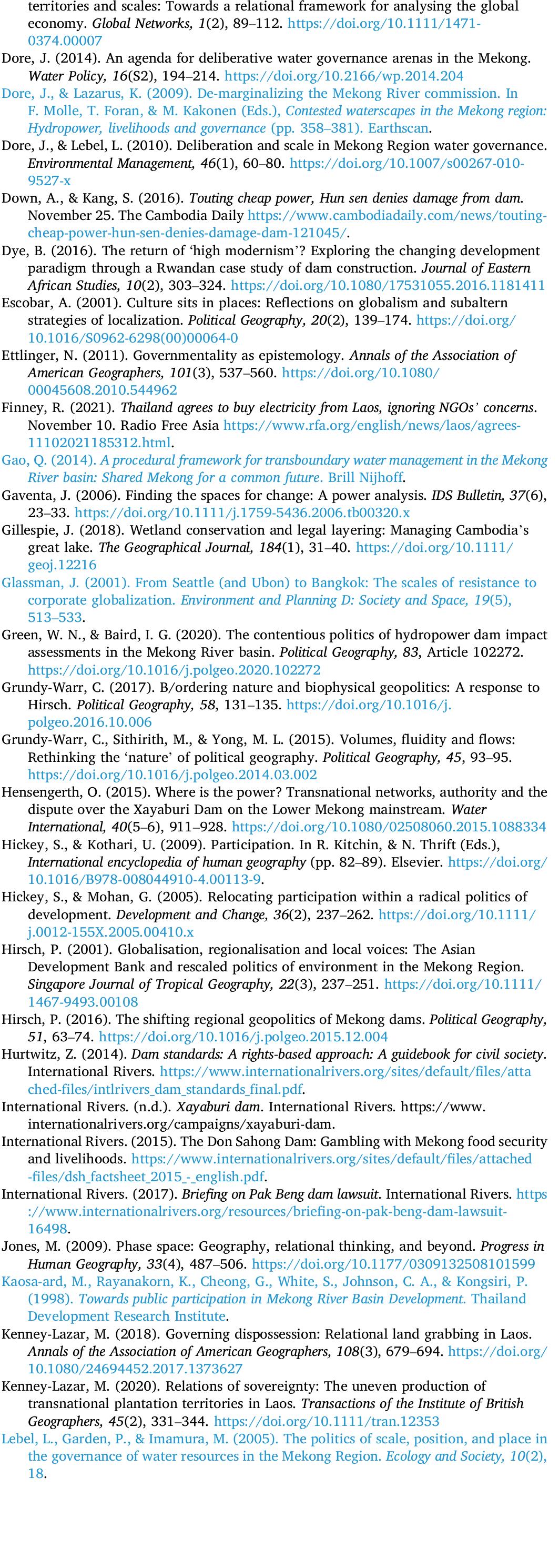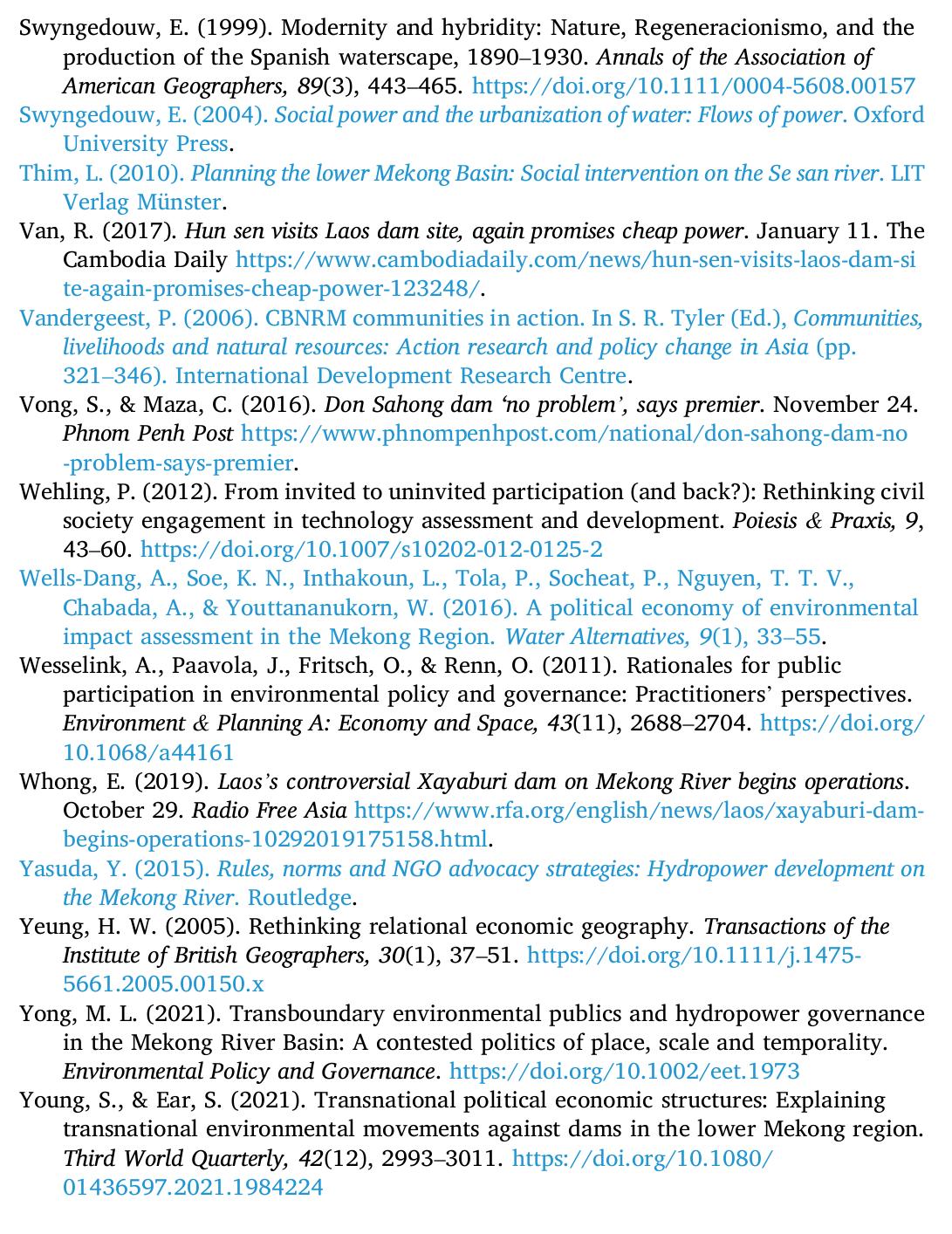 This study proposes a conceptualisation of transboundary environmental publics (TEPs) to interrog... more This study proposes a conceptualisation of transboundary environmental publics (TEPs) to interrogate the distinctive pathways through which contestations over public participation and 'stakeholder engagement' in transboundary environmental governance have emerged. While much attention has been paid to how the discourse and practices of public participation have been co-opted by powerful actors to serve vested interests, fewer studies have questioned how the contingent and fragmented nature of 'publics' entangled with a politics of representation have contributed towards the failings of public participation. This paper examines how state and nonstate TEPs have emerged as multi-dimensional, material and discursive entities within hybrid hydropower governance arrangements in the Mekong River Basin. Public participation in relation to hydropower dams on the Mekong River's mainstream is intertwined with the contingent formation of TEPs through the Mekong River Commission's Procedures for Notification, Prior Consultation and Agreement (PNPCA). Contestations over public participation may be understood by examining the specific ways in which 1) 'publics' were assembled, 2) notions of 'place' were interpreted, 3) scalar constructions were influenced by centre-periphery power dynamics and 4) temporality was defined. To understand how this convening of 'publics' fundamentally influences the potential for meaningful public participation, this paper contrasts the TEPs formed through the PNPCA and the Save the Mekong Coalition (STMC), a transnational activism network. The STMC TEP provided reimaginations of scalar constructions and broadened definitions of publics, places, and temporality in participation, reflecting how the topographical and discursive practices that underlie the creation of TEPs have important implications for their legitimacy and effectiveness in influencing decision making.