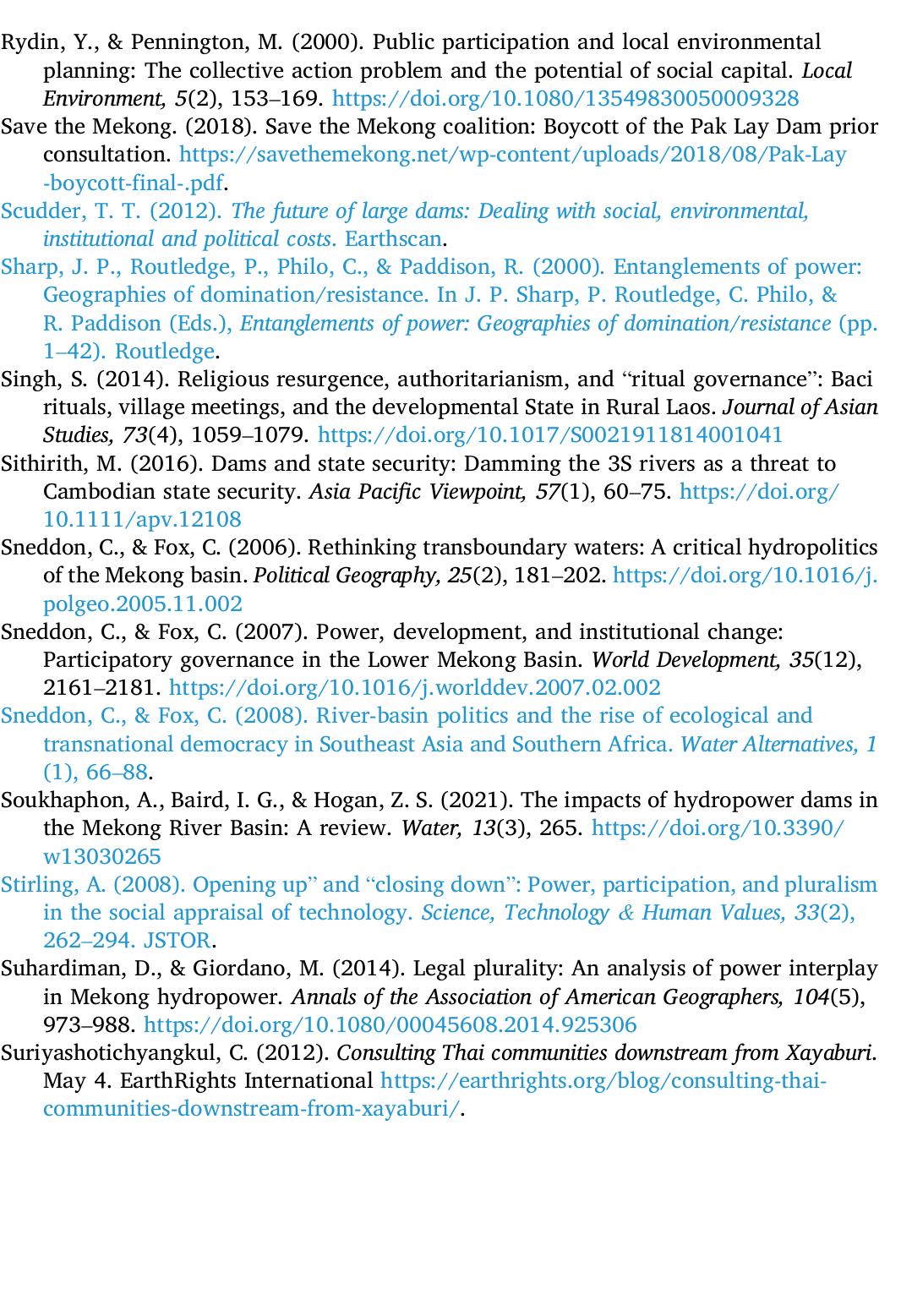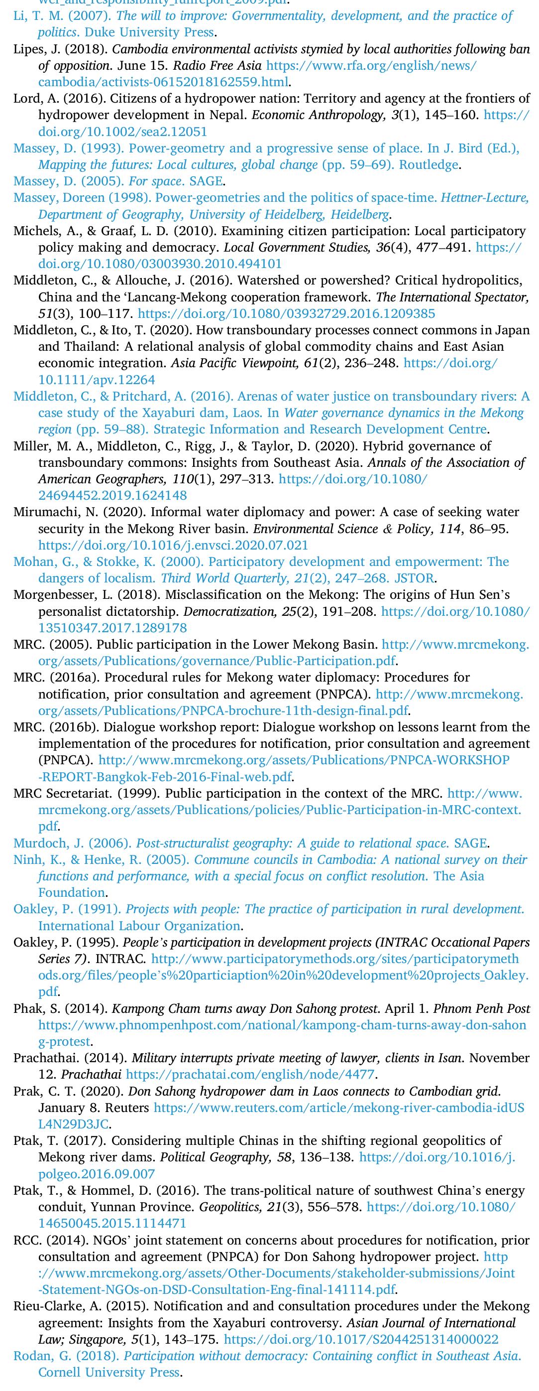 The Lao People's Democratic Republic's aspirations to become the 'battery' of Southeast Asia has ... more The Lao People's Democratic Republic's aspirations to become the 'battery' of Southeast Asia has involved plans for a cascade of hydropower dams on the mainstream of the transboundary Mekong River. This has triggered the unprecedented undertaking of public stakeholder consultations under the Mekong River Commission's Procedures for Notification, Prior Consultation and Agreement (PNPCA). This paper focuses on PNPCA stakeholder consultations organized in Thailand and Cambodia, and seeks to understand how these stakeholder consultations, despite their merits in information sharing, have come to be criticized by civil society as a 'rubber stamp' for 'participation' in Lao hydropower development. Building upon the literature on public participation in development, critical hydropolitics, and stakeholder engagement in Mekong water governance, we seek to conceptualize a critical politics of public participation by adopting a relational approach towards identifying the key challenges relating to participation. We suggest that a relational approach must consider how the interrelations between the multiple formal and informal tracks of stakeholder engagement shape one another and overall opportunities for participation, and how power relations within these spaces impact on perceptions towards public participation. Distrust towards state-organized participatory spaces can be traced from the stateorganized participatory spaces to another key interrelation: the power relations between state and nonstate actors in the multi-scalar political spaces that extend beyond participatory spaces. This paper examines how antiparticipatory forces pose a challenge to the emergence of both state and nonstate participatory spaces, providing additional insights into the state-society dynamics that influence environmental outcomes around large-scale infrastructural development.