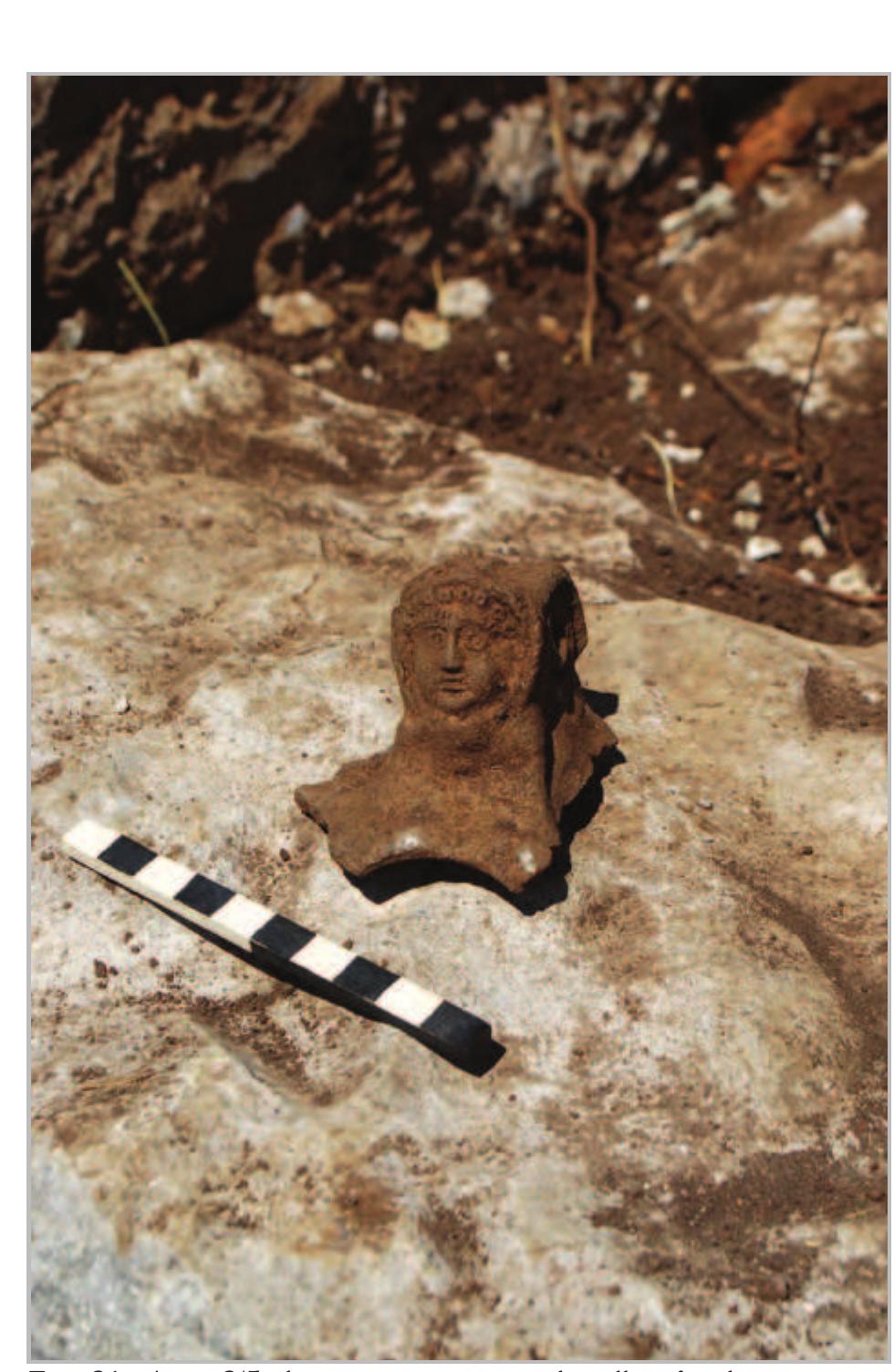 Mazraa 571 is mainly a funerary site, the moulded lead-glazed skyphos was discovered as a part of a cluster in a funerary zone between burials. It is covered with a green glaze on the outside and yellow glaze on the inside. Moreover, a plant relief pattern is moulded all over the vessel, this type of pottery was never common.