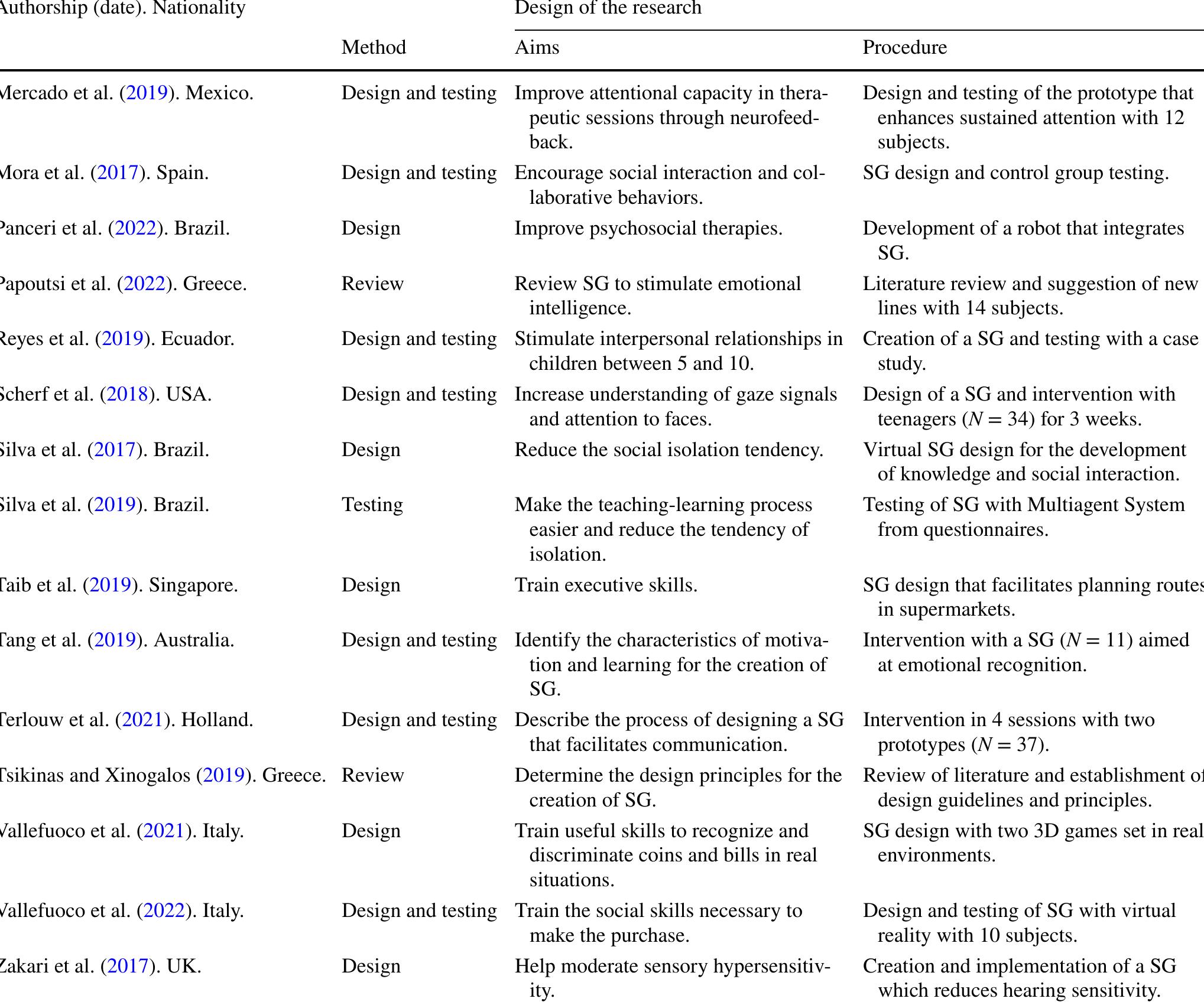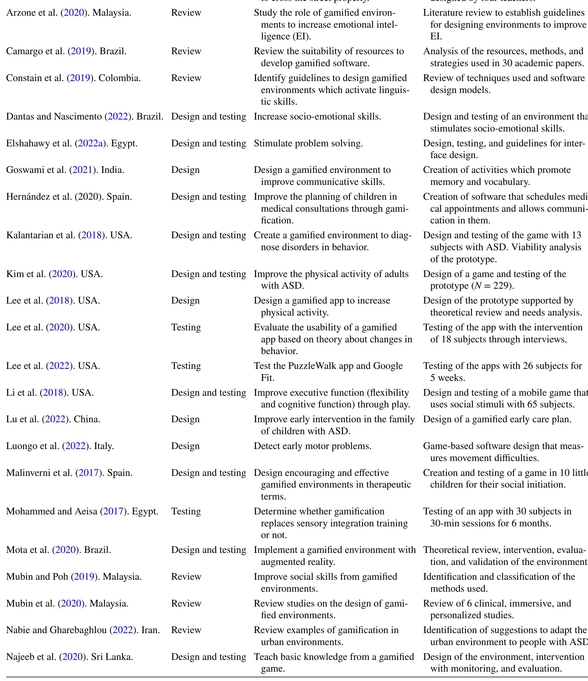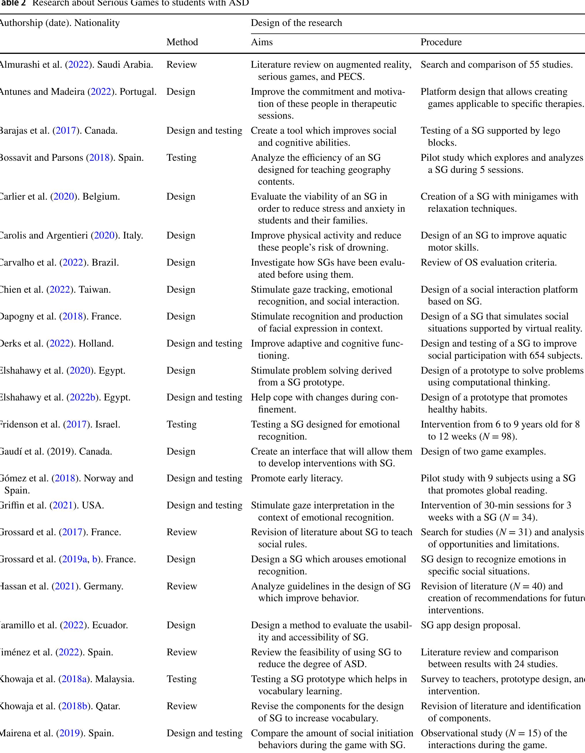 The aim of this study is to review the available research (N = 70) derived from the use of Gamifi... more The aim of this study is to review the available research (N = 70) derived from the use of Gamified Environments and Serious Games with people with Autistic Spectrum Disorder (ASD), identifying: authorship, nationality, publication period, topic, and design of the investigation. After that, the advantages and limitations observed are identified. Results indicate that most of them are focused on the design and testing of prototypes, (mostly) linked to the increase of social and emotional skills. The revision highlights that the game's mechanics and dynamics (feedback, rewards, missions, etc.) involve students from motivation. There is unanimous agreement to emphasize the positive impact of these resources to increment self-control, self-conscience, autonomy, and empathy.