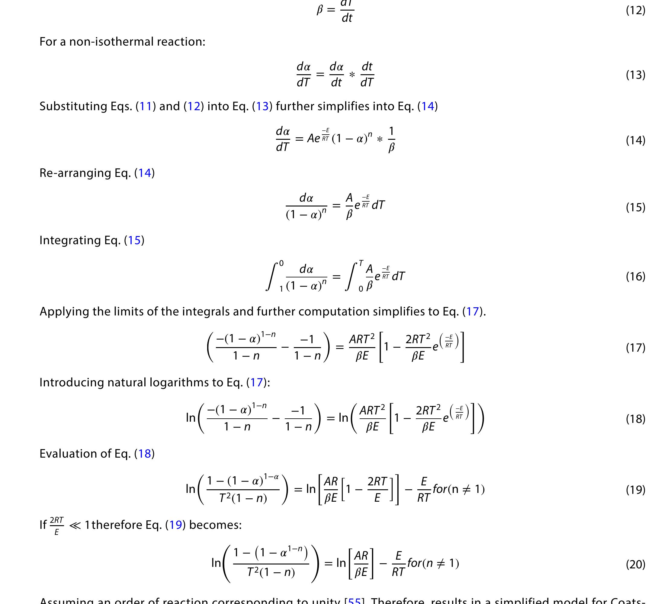 This study comprehensively analyzes the thermal decomposition characteristics as well as the kine... more This study comprehensively analyzes the thermal decomposition characteristics as well as the kinetic and thermodynamic parameters of five biomass wastes, including coffee husk, groundnut shell, macadamia nutshell, rice husk, and tea waste, using Thermogravimetric Analysis (TGA) and the Coats-Redfern method. The TGA experiments were conducted on a PerkinElmer STA 6000 instrument under an inert N 2 atmosphere with a heating rate of 20 • C/min, spanning a temperature range from 25 • C to 950 • C. The results identified three distinct pyrolysis stages: drying, devolatilization, and char formation, with macadamia nutshell demonstrating the highest thermal reactivity and efficient devolatilization characteristics, reflected by its lowest initial devolatilization temperature (175 • C) and highest peak temperature (380 • C). Kinetic analysis revealed that coffee husk had the highest overall activation energy (E a) of 60.59 kJ/mol, indicating complex thermal degradation behavior. The thermodynamic evaluation showed that coffee husk also exhibited the highest enthalpy change (ΔH=55.46 kJ/mol) but the lowest Gibbs free energy change (ΔG=148.34 kJ/mol), suggesting high energy requirements for decomposition but relatively more spontaneous reactions compared to other biomass types. Macadamia nutshell demonstrated high ΔG (163.24 kJ/mol) and moderate ΔH (32.44 kJ/mol), reflecting greater resistance to spontaneous decomposition. The comprehensive pyrolysis index (CPI) and devolatilization index (D dev) confirmed macadamia nutshell as the most reactive biomass, while rice husk exhibited the lowest reactivity. The findings highlight the importance of multi-step kinetic analysis for accurately understanding pyrolysis processes, providing critical insights for optimizing biomass conversion for energy production. Future research should explore co-pyrolysis with varied biomass mixtures and advanced kinetic modeling to enhance energy yields.