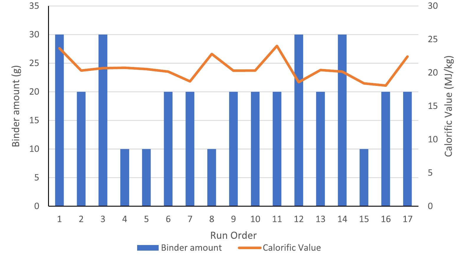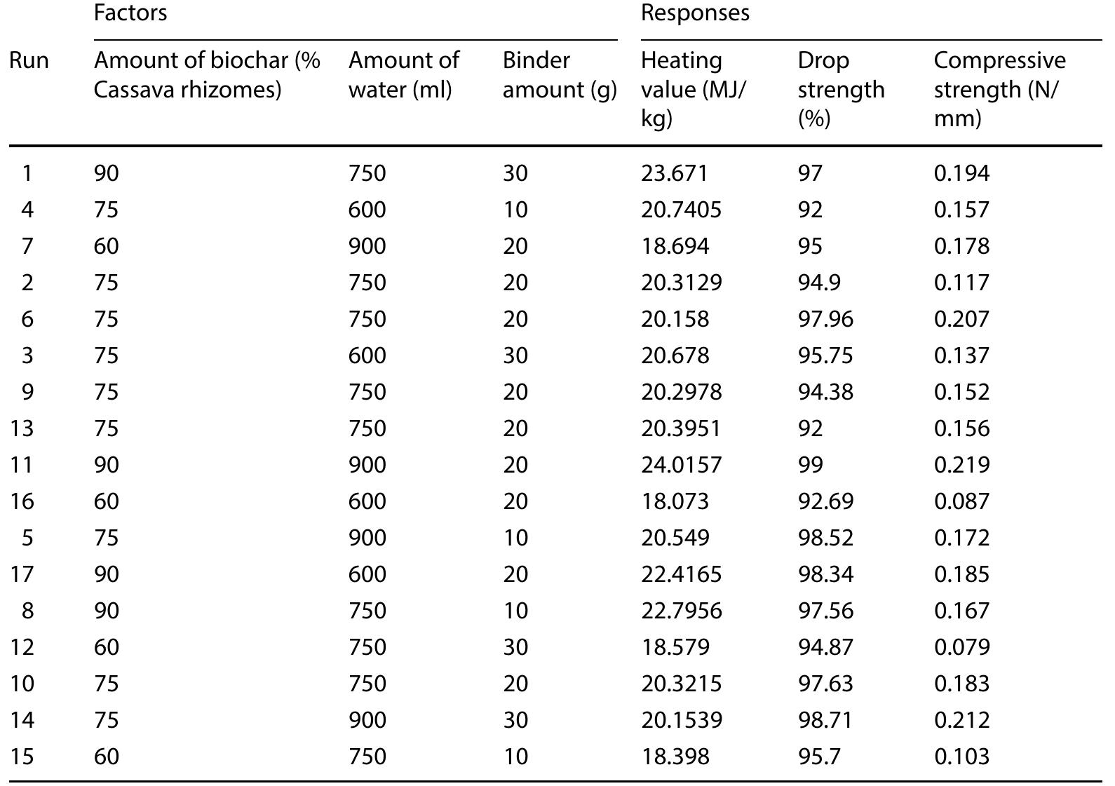 Composite briquettes from agricultural residues are a potential sustainable domestic solid fuel r... more Composite briquettes from agricultural residues are a potential sustainable domestic solid fuel resource. This study aimed to develop and characterize composite briquettes developed from cassava rhizomes and groundnut stalks with jackfruit waste binder as an alternative sustainable fuel for domestic cooking applications. Cassava rhizomes and groundnuts stalks feedstock were carbonized in a step-down kiln under slow pyrolysis conditions at temperatures between 400 and 500 ℃. Thermogravimetric analysis was used to determine the proximate and thermal properties of the developed composite briquettes. Bomb calorimetry was used to determine their heating values. Relaxed density, drop strength and compressive strength results were used to determine the mechanical properties of the developed briquettes. Design of Experiments (Box Behnken design) was used to evaluate the effect of factors (biochar amount, jackfruit waste binder amount, and amount of water) on the mechanical and thermal properties of the developed composite briquettes. The Coats-Redfern kinetic model was used to determine the activation energy for the developed briquettes. Calorific values and drop strength of developed composite briquettes ranged from 18.1 to 24.0 MJ/kg and 92–99%, respectively. Combustion performance results indicated that ignition temperature increased from 155.1 to 184
