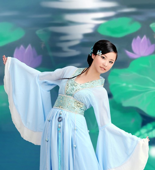 Embrace the elegance of ancient China with this stunning light blue Hanfu, featuring delicate floral embroidery along the collar and waist sash. Crafted from flowing, lightweight fabric, the wide bell sleeves and tiered skirt create a graceful silhouette perfect for classical dance or traditional photography. This authentic-style costume captures the ethereal beauty of a lotus fairy, making it an ideal choice for cultural performances, festivals, or cosplay events.