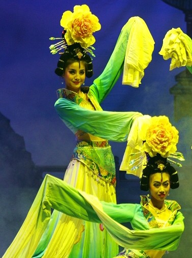 Captivate your audience with this stunning traditional Chinese classical dance costume, featuring vibrant lime green fabric and intricate gold embroidery. The ensemble includes dramatic flowing water sleeves for fluid movement and a magnificent large yellow flower headpiece that adds height and elegance. Perfect for stage performances, cultural festivals, and dance competitions, this outfit embodies the grace and beauty of ancient Chinese dynastic aesthetics.