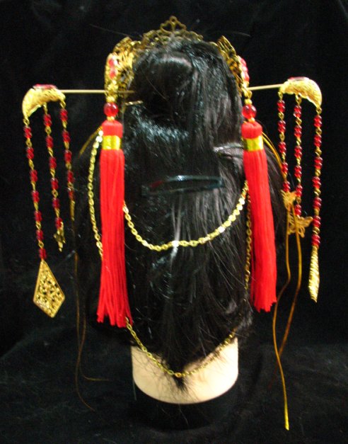 Elevate your traditional performance with this exquisite gold filigree crown, featuring a striking red centerpiece and intricate detailing inspired by ancient Chinese royalty. Designed specifically for Peking Opera and classical dance, this headpiece includes long side hairpins adorned with cascading red bead chains that sway gracefully with movement. Crafted for durability and visual impact, it serves as a stunning accessory for Hanfu enthusiasts, stage actors, and cultural cosplayers looking for authentic period styling. The piece captures the elegance of traditional Chinese aesthetics, making it an essential addition to any theatrical wardrobe or cultural collection.