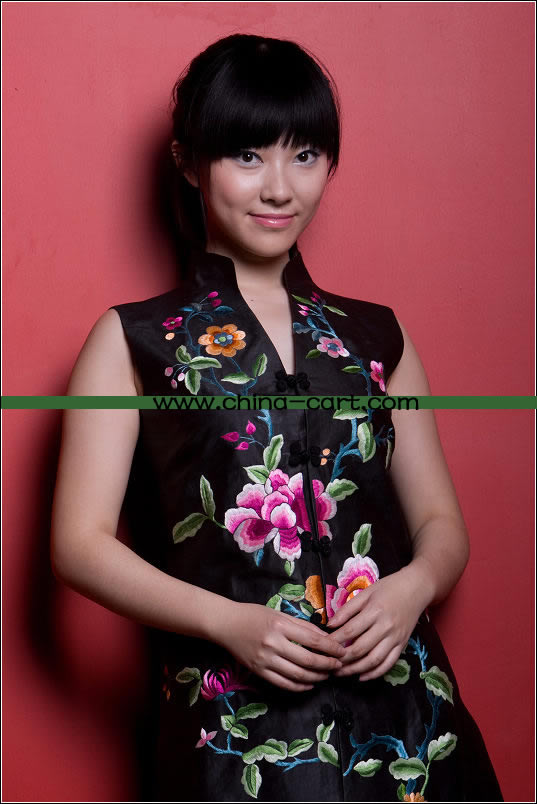 Crafted from luxurious black silk, this sleeveless Tang suit vest features exquisite floral embroidery with vibrant peony blossoms that symbolize prosperity and honor in Chinese culture. The garment showcases traditional frog buttons and a classic collar design, offering a perfect blend of ancient elegance and modern comfort. Ideal for tea ceremonies, cultural festivals, or adding a unique ethnic touch to your daily wardrobe, this top is a timeless piece of oriental fashion.