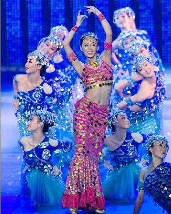 This stunning magenta dance costume features intricate gold and green coin embellishments that shimmer brilliantly under stage lights, designed to captivate any audience. Perfect for professional stage performances and cultural showcases, the ensemble includes a supportive halter top, a flowing skirt, and matching accessories like a jeweled headpiece and wrist cuffs. The exotic design draws inspiration from traditional Silk Road aesthetics, blending belly dance elements with folk dance flair for a mesmerizing visual impact. Crafted with high-quality, flexible materials, this outfit ensures maximum comfort and freedom of movement for dancers during energetic routines.