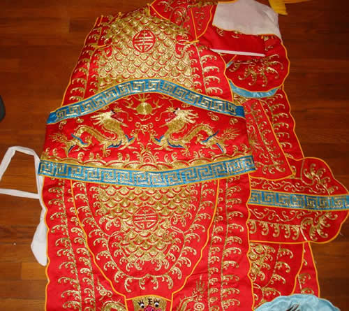 This authentic Sichuan Opera costume features a striking red robe with intricate gold embroidery, specifically designed for the dramatic art of Bian Lian. The complete ensemble includes an elaborate headdress with red pom-poms, majestic back flags, and a long red beard to create a commanding presence. Crafted for durability and visual impact, this outfit is ideal for professional stage performances, cultural festivals, and theatrical productions. Embrace the mystery of Chinese heritage with this premium outfit, perfect for actors mastering the ancient skill of instant mask changing.