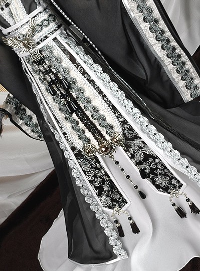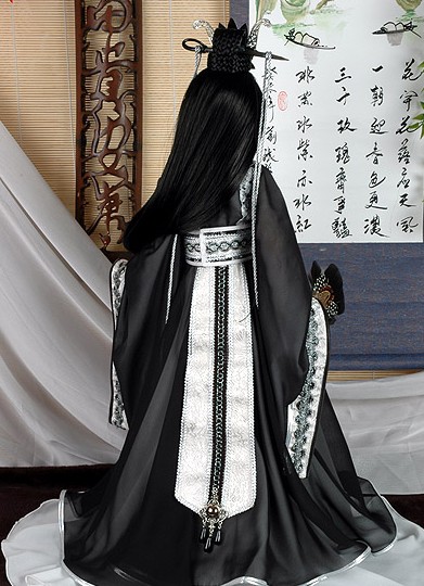 This stunning black and silver Hanfu ensemble captures the elegance of ancient Chinese nobility with intricate embroidery and flowing wide sleeves. The outfit features delicate lace trim, shimmering tassels, and a majestic headdress adorned with feathers and jewels, perfect for high-end doll displays. Designed for traditional culture enthusiasts, this costume embodies the sophisticated aesthetic of the Hanfu movement, bringing historical grandeur to your collection. Ideal for BJDs or collector dolls, this set transforms your figure into a regal character from a classic wuxia drama.
