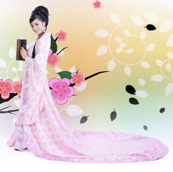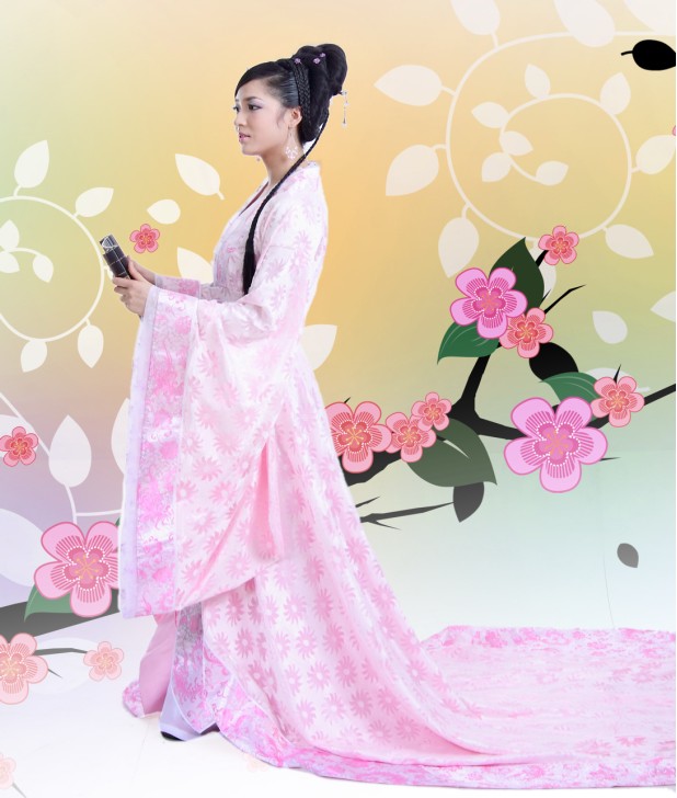 Embrace the elegance of ancient China with this stunning pink floral Hanfu, featuring flowing wide sleeves and a dramatic long train. Crafted from lightweight fabric with intricate floral patterns, this traditional costume is perfect for cultural festivals, stage performances, and artistic photography. Whether you are attending a Hanfu gathering or cosplaying a historical character, this dress captures the grace and sophistication of classical Chinese aesthetics.