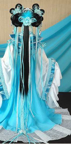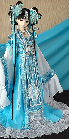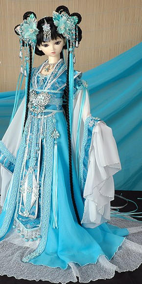 Adorn your doll in this breathtaking turquoise Hanfu ensemble, featuring intricate silver embroidery and flowing layers that capture the essence of ancient Chinese elegance. The set includes elaborate floral hairpins with dangling tassels and sparkling jewelry, creating a complete fairy-like look perfect for display or photography. Designed for collectors and enthusiasts of traditional culture, this high-quality costume transforms your ball-jointed doll into a graceful celestial maiden.