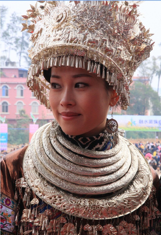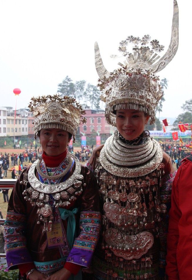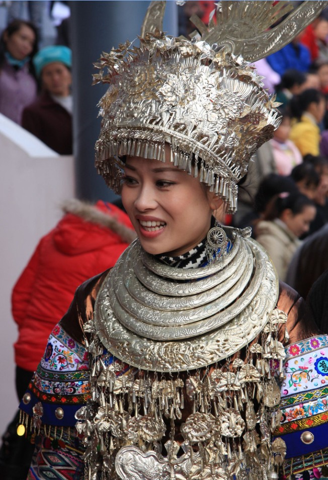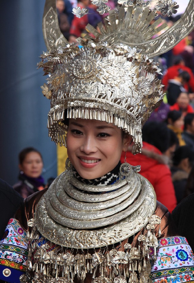 This stunning traditional Miao ethnic costume features a magnificent silver horn headdress and layers of intricate silver jewelry. The outfit showcases vibrant, hand-embroidered patterns on high-quality fabric, adorned with dangling silver pendants and colorful tassels. Perfect for cultural festivals, folk dance performances, or wedding ceremonies, this attire celebrates the rich heritage and craftsmanship of the Miao people. The ensemble is completed with heavy silver neck rings that symbolize wealth and beauty in traditional culture.