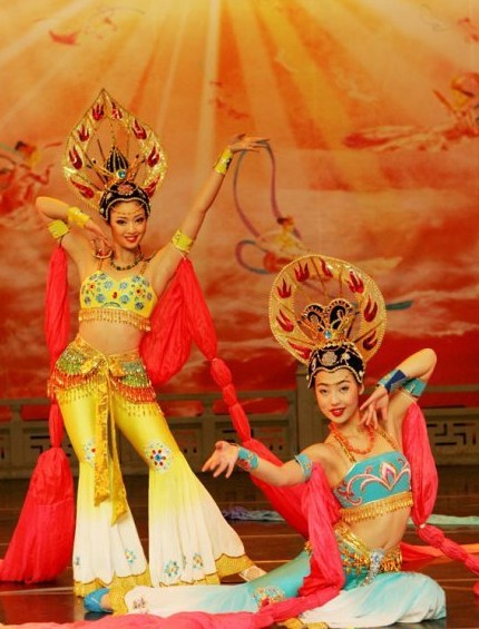 Capture the ethereal beauty of ancient Dunhuang murals with this exquisite Flying Apsaras dance costume, designed to bring classical Chinese art to life. The ensemble features a beautifully embroidered teal crop top and flared gradient pants that flow gracefully with every movement. Paired with vibrant, extra-long silk ribbons in hues of blue, green, and red, this outfit creates a stunning visual spectacle on stage. Ideal for professional performances, cultural festivals, and dance competitions, this traditional attire allows dancers to embody the elegance of celestial beings.