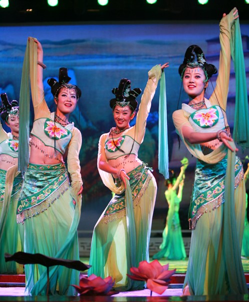 This stunning green costume set is designed for traditional Chinese folk dance, featuring an elegant peacock-inspired aesthetic perfect for captivating stage performances. The outfit includes a fitted embroidered crop top with flowing sheer "water sleeves" and a matching long skirt that enhances fluid, graceful movement. Complete with an elaborate matching headdress, this ensemble is crafted from lightweight, breathable fabrics to ensure comfort during dynamic choreography. Ideal for cultural showcases and dance troupes, this attire beautifully captures the vibrancy and artistic heritage of ancient Chinese dance traditions.