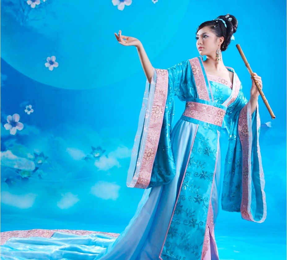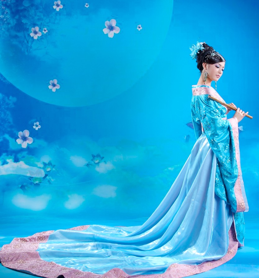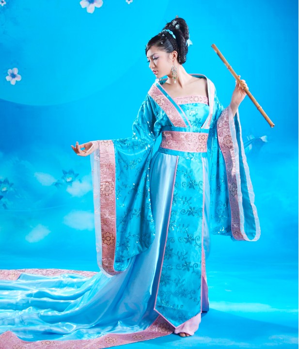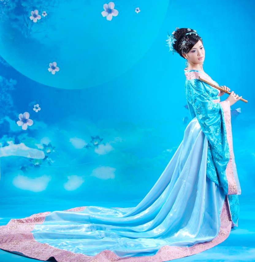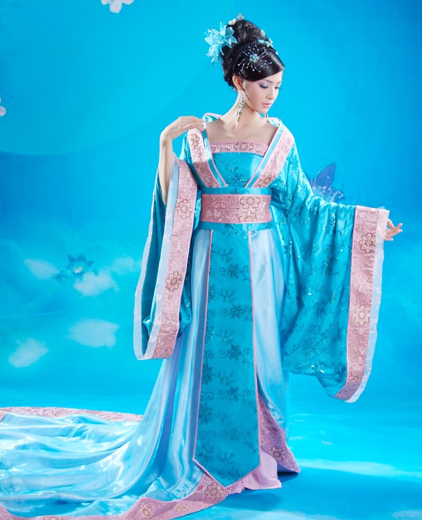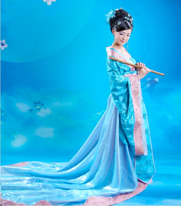 Immerse yourself in the elegance of ancient China with this stunning blue Hanfu costume, featuring a flowing silhouette and delicate pink embroidery. Crafted from luxurious, shimmering fabric with wide sleeves, this traditional dress is perfect for stage performances, cultural festivals, or historical cosplay. The ensemble includes a long, graceful train and comes styled to capture the timeless beauty of a Chinese palace lady. Ideal for dancers and photography enthusiasts, this outfit allows you to embody the grace and sophistication of classical Chinese heritage.