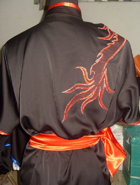 This elegant black satin uniform features a striking red dragon embroidery, symbolizing power and strength in traditional Chinese culture. Crafted with a classic mandarin collar and intricate frog buttons, it offers authentic style while allowing for fluid movement during training. Perfect for Wushu, Tai Chi, and Kung Fu practitioners, this set includes a matching orange sash for a complete, professional look. The durable, breathable fabric ensures comfort for both rigorous practice sessions and cultural stage performances.
