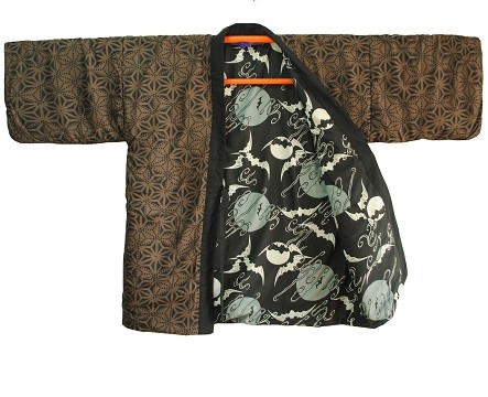 This striking men's Japanese Haori jacket features a bold black design adorned with edgy skull motifs and swirling ukiyo-e style clouds. Crafted for both comfort and visual impact, it boasts a classic wide-sleeve cut and is finished with a beautiful bronze Asanoha (hemp leaf) geometric patterned lining. The jacket secures with traditional orange toggles, making it perfect for layering over kimono or wearing as unique streetwear. Ideal for cosplay events, cultural festivals, or adding a gothic touch to your wardrobe, this piece seamlessly blends historical aesthetics with modern style.