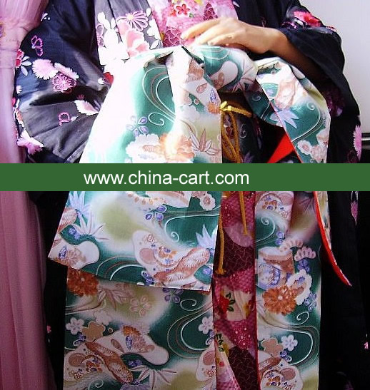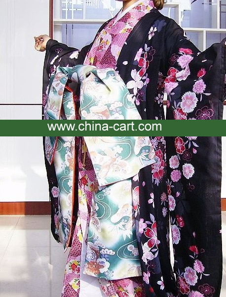 This stunning black furisode kimono features vibrant pink and white floral patterns, exuding elegance and traditional Japanese beauty. It is paired with an elaborate teal obi sash adorned with auspicious white cranes and flowing water motifs, symbolizing longevity and good fortune. Perfect for formal occasions such as weddings, coming-of-age ceremonies, or cultural festivals, this complete set offers an authentic experience. Crafted with attention to detail, the flowing sleeves and intricate designs make it a timeless piece for any traditional wardrobe.