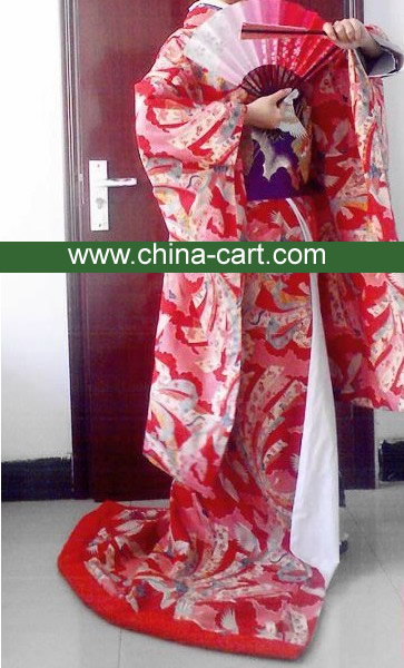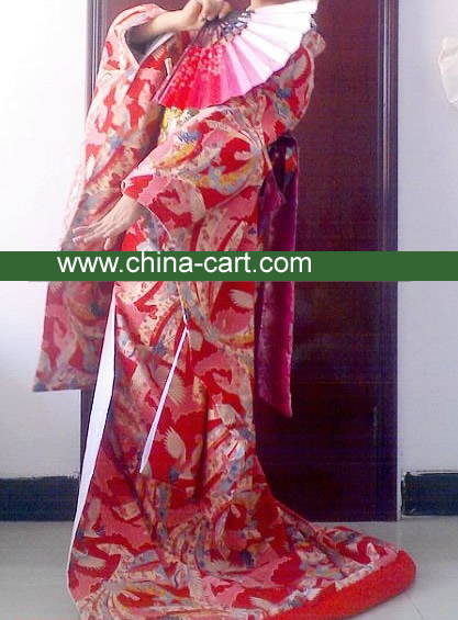 This exquisite traditional Japanese Uchikake kimono features a vibrant red base adorned with intricate floral and crane embroidery, symbolizing good fortune and longevity. The ensemble includes a contrasting purple obi sash with detailed floral patterns, creating a stunning visual impact perfect for brides or stage performers. Crafted with high-quality fabric and a dramatic trailing hem, this garment embodies the elegance of Japanese culture and is ideal for weddings, tea ceremonies, or theatrical productions.