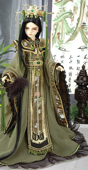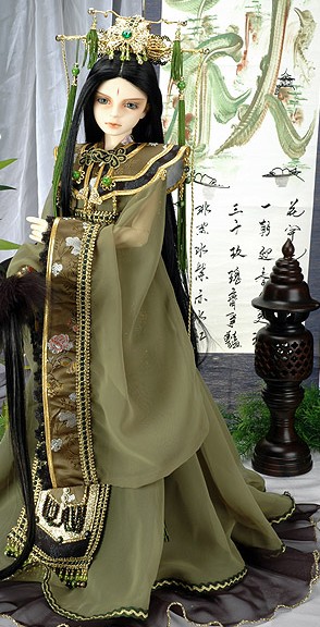 Elevate your doll collection with this exquisite traditional Chinese Hanfu costume set, featuring a regal olive green robe adorned with intricate gold embroidery and beadwork. The ensemble includes a stunning, elaborate headdress with dangling green tassels and golden ornaments, perfectly capturing the elegance of ancient Chinese nobility. Designed specifically for Ball Jointed Dolls (BJD) or similar fashion dolls, this outfit is ideal for historical cosplay, professional photography, and display. Immerse yourself in the beauty of Oriental aesthetics with this high-quality craftsmanship that brings the fantasy of ancient dynasties to life.