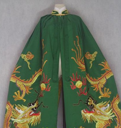 This exquisite green hooded cloak showcases magnificent golden dragon embroidery, a symbol of strength and imperial authority in Chinese culture. Designed with a flowing silhouette and intricate detailing, it serves as an ideal costume for traditional opera, historical reenactments, and cosplay events. The durable fabric and vibrant colors ensure a striking appearance, making it a perfect addition to any traditional Chinese attire collection.