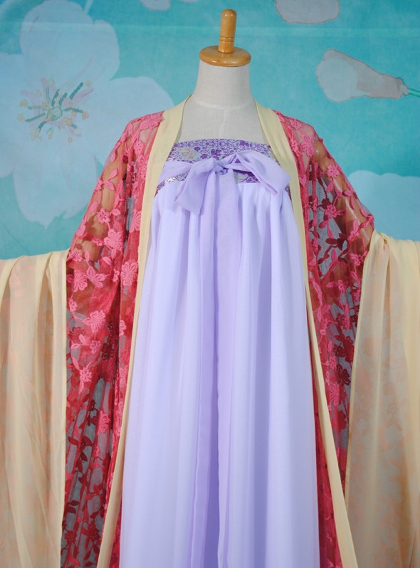 Step into the elegance of ancient China with this exquisite Tang Dynasty-inspired Hanfu costume, featuring a flowing lavender inner gown paired with a sheer, pink floral-embroidered outer cloak. Crafted from lightweight, breathable fabrics, the ensemble showcases wide sleeves and a dramatic train, perfect for creating an ethereal, fairy-like silhouette. Ideal for traditional cultural festivals, stage performances, or professional photography, this attire captures the romantic aesthetics of imperial Chinese history. The delicate bow detail at the chest and soft color palette add a touch of grace, making it a stunning choice for Hanfu enthusiasts and cosplayers alike.