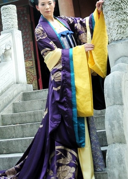 Step into the elegance of ancient China with this stunning Tang Dynasty-inspired Hanfu ensemble. Featuring a rich purple outer robe with gold floral embroidery and wide, flowing sleeves, this costume captures the grandeur of imperial court fashion. The high-waisted blue patterned skirt adds a graceful silhouette, making it perfect for traditional dance performances or historical photography. Crafted with attention to detail, this outfit is ideal for cultural festivals, cosplay events, or anyone wishing to experience the beauty of traditional Chinese heritage.