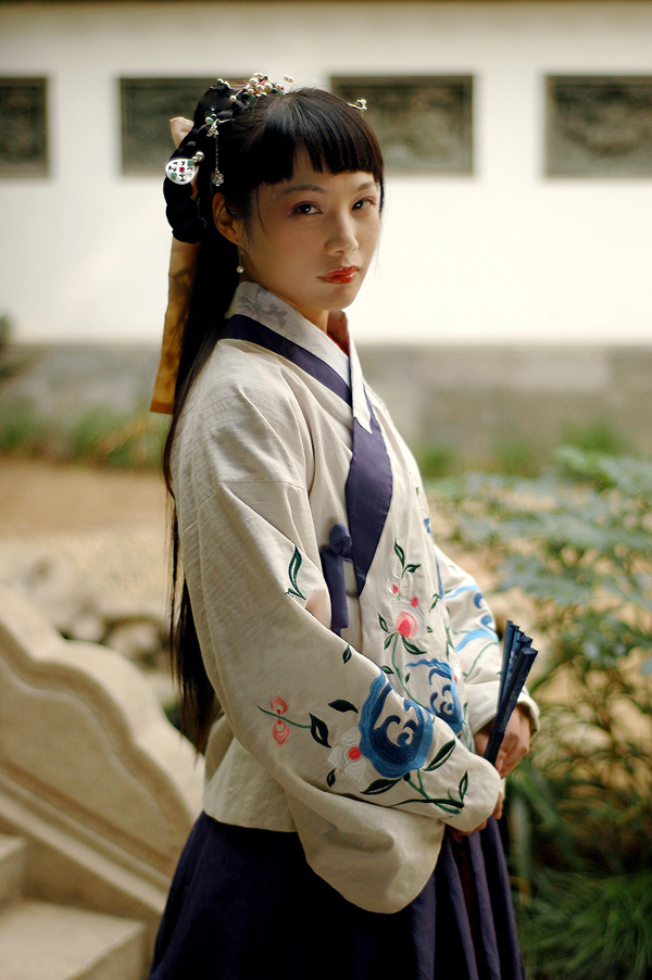 Embrace the elegance of ancient China with this exquisite Ming Dynasty-style Hanfu set, featuring a crisp white cross-collar jacket adorned with delicate floral and cloud embroidery. The ensemble is completed by a voluminous dark blue pleated skirt showcasing intricate wave and auspicious cloud motifs near the hem, creating a striking visual contrast. Crafted from high-quality, flowing fabrics, this costume is perfect for traditional festivals, cultural performances, Hanfu gatherings, or professional photography sessions. Experience the timeless beauty of Chinese heritage through this authentic reproduction that captures the grace and sophistication of historical attire.