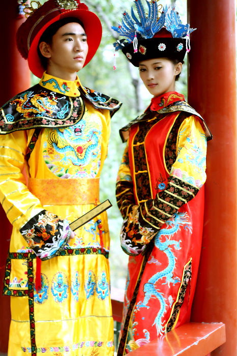 Step into history with this exquisite Traditional Chinese Qing Dynasty palace costume, designed to replicate the regal attire of an ancient empress or noble concubine. The ensemble features a vibrant red and yellow robe adorned with intricate dragon embroidery and wide, flowing sleeves that signify imperial status and elegance. Complete with a stunning, elaborate headdress featuring blue feather accents and dangling pearls, this outfit captures the authentic grandeur of the Manchu court style. Perfect for stage performances, cultural festivals, historical reenactments, or professional photography, this high-quality costume allows women to embody the grace of ancient Chinese royalty.