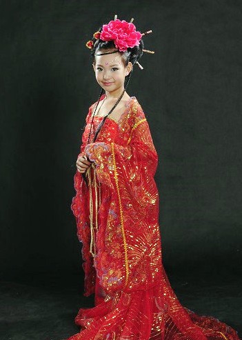 Step into history with this exquisite red Hanfu costume, designed specifically for young girls to embody the elegance of ancient Chinese princesses. Crafted with vibrant red fabric and adorned with intricate gold embroidery, this traditional outfit features flowing wide sleeves that are perfect for classical dance performances. The ensemble includes a matching floral headpiece, completing the authentic look that is ideal for cultural festivals, stage shows, or special photo shoots. Celebrate rich heritage and timeless beauty with this stunning traditional attire that brings ancient stories to life.