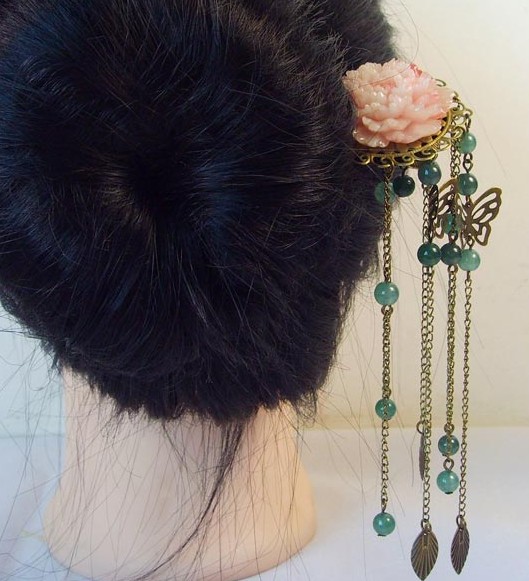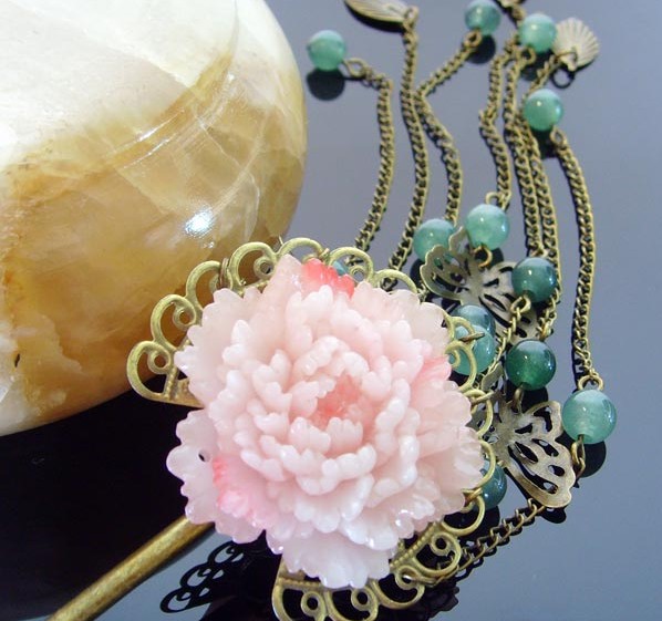 This exquisite hair accessory features a delicate, carved pink peony flower set in an ornate antique bronze filigree base. Elegant chains dangle from the base, adorned with translucent teal beads and a graceful metal butterfly charm that adds movement and charm. Perfect for pairing with traditional Hanfu clothing or Qipao, this hairpin brings a touch of classical elegance to weddings, festivals, and cultural events. It serves as a beautiful statement piece for women who appreciate ancient Chinese aesthetics and traditional craftsmanship.