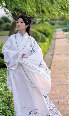 Embrace the elegance of ancient China with this exquisite white Hanfu robe featuring delicate ink-wash bamboo motifs. Crafted from breathable natural fabrics, this cross-collar garment offers a comfortable fit perfect for tea ceremonies or cultural photography. The minimalist black and white design reflects traditional scholarly aesthetics, making it an ideal choice for women seeking authentic historical attire. Its flowing wide sleeves and traditional cut capture the serene spirit of classical Chinese fashion.