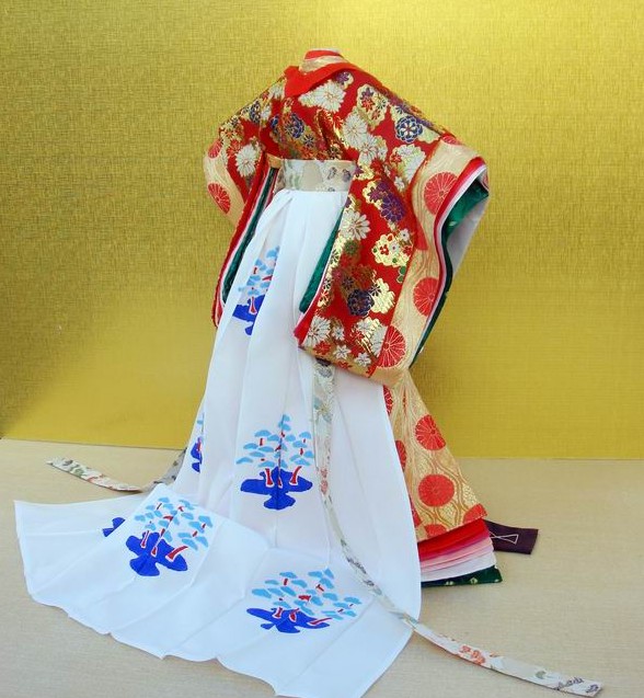 This exquisite traditional Japanese costume features a vibrant red outer robe adorned with intricate gold floral and fan-shaped pine motifs, symbolizing prosperity and longevity. Designed in the style of a Heian-period court lady, it showcases elegant layered collars in white and emerald green, paired with a deep purple bottom garment for a truly regal appearance. Ideal for Hina Matsuri celebrations, cultural exhibitions, or stage performances, this outfit beautifully captures the elegance of ancient Japanese aristocracy. Crafted with rich brocade fabrics, it serves as a stunning representation of traditional textile artistry and heritage.