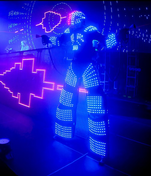 Illuminate the stage with this high-tech LED robot costume featuring a full-body array of programmable blue lights and striking red and green laser beams. Perfect for futuristic stage performances, dance competitions, night club events, and grand opening ceremonies, this suit guarantees a mesmerizing visual experience. Designed for professional performers, the lightweight yet durable material allows for fluid movement while the integrated laser system creates dramatic effects in dark environments. Blend modern technology with performance art to create an unforgettable spectacle that captivates audiences.
