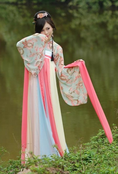 Step back in time with this exquisite Tang Dynasty-inspired Hanfu, featuring an intricately embroidered blouse with wide sleeves and a flowing, multi-colored panel skirt. Crafted from lightweight, breathable fabrics, this traditional Chinese costume offers both elegance and comfort for photography, cultural festivals, or cosplay events. The soft pastel palette of pink, blue, and cream captures the romantic aesthetic of ancient Chinese nobility, making it a perfect choice for traditional culture enthusiasts.