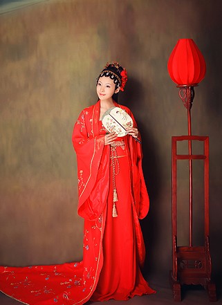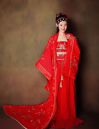 This exquisite red Hanfu captures the grandeur of the Tang Dynasty with its flowing wide sleeves and intricate gold floral embroidery. Designed for brides and performers, this traditional Chinese costume features a majestic long train and layered silhouette that exudes elegance. The vibrant red fabric symbolizes joy and prosperity, making it an ideal choice for weddings, cultural festivals, and historical photography. Crafted with attention to detail, this ancient attire allows women to immerse themselves in the beauty of classical Chinese heritage.