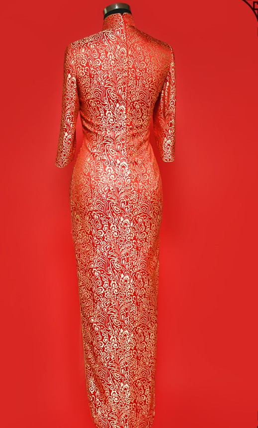 This exquisite red Chinese Qipao features an intricate gold brocade pattern, embodying traditional craftsmanship and timeless beauty. Designed with a classic mandarin collar and flattering three-quarter sleeves, this long cheongsam offers a sophisticated silhouette perfect for formal occasions. The vibrant red color symbolizes good fortune and joy, making it an ideal choice for wedding ceremonies, banquets, or celebrating Chinese New Year. Crafted from high-quality fabric with a luxurious sheen, this dress combines cultural heritage with modern elegance for a stunning appearance.