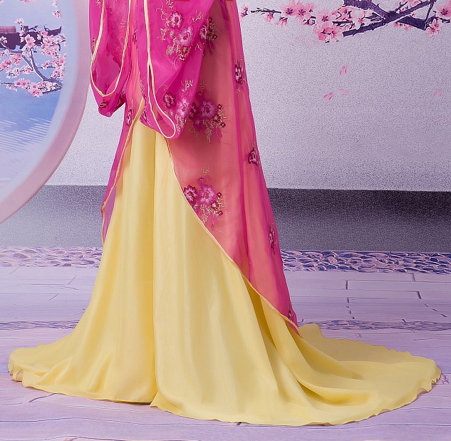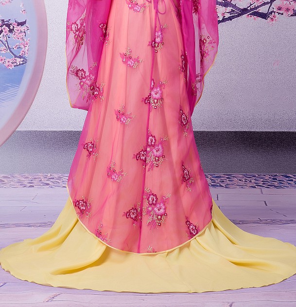 Step back in time with this exquisite Ancient Chinese Tang Dynasty Hanfu costume, designed for the modern woman who appreciates traditional elegance. This ensemble features a stunning magenta sheer outer robe adorned with delicate floral embroidery, paired with a flowing golden-yellow skirt that creates a regal silhouette. Perfect for stage performances, cultural festivals, or immersive photography sessions, this outfit captures the ethereal beauty of a palace lady. The high-quality fabrics and intricate details ensure you look radiant while celebrating the rich heritage of Chinese fashion.