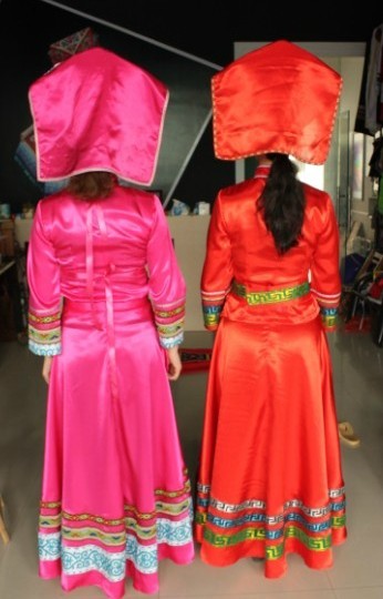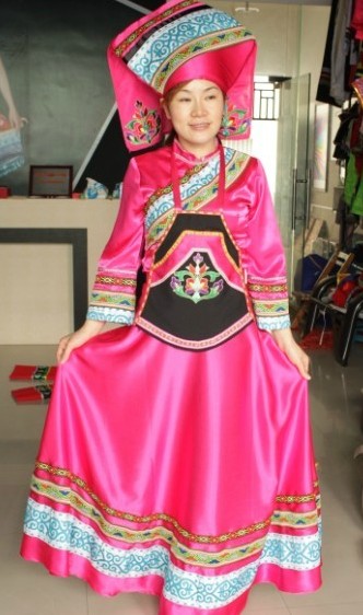 Showcase the vibrant beauty of Chinese heritage with this exquisite traditional ethnic minority costume, featuring rich satin fabrics in striking pink and red hues. Each dress is adorned with intricate, colorful embroidery and geometric patterns, complemented by a unique, structured headpiece that signifies cultural pride. Ideal for folk dance performances, cultural festivals, or wedding ceremonies, this complete ensemble captures the elegance and spirit of the Zhuang nationality.