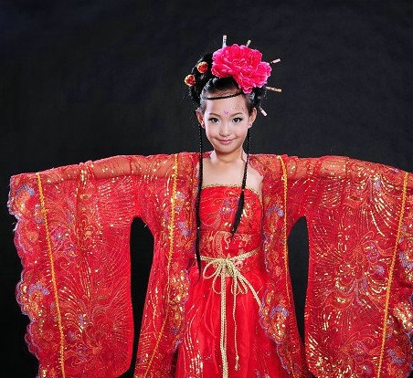 This exquisite traditional Chinese Hanfu costume features a vibrant red gown with intricate gold embroidery, capturing the elegance of Tang Dynasty palace fashion. The flowing wide sleeves and layered skirt are designed to enhance movement, making it perfect for classical folk dance performances and stage productions. Crafted with attention to detail, this outfit celebrates ancient Chinese culture and is ideal for Lunar New Year celebrations or cultural festivals. The ensemble includes traditional hair accessories to complete the authentic look of a young oriental princess.