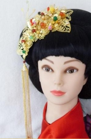 This exquisite hair crown features intricate gold filigree work shaped like a butterfly, adorned with vibrant multi-colored gemstones that catch the light. Long, flowing gold tassels hang gracefully from the side, adding dynamic elegance and movement to your hairstyle. Perfectly designed for traditional Hanfu attire, this accessory is ideal for weddings, historical reenactments, or cultural celebrations. It captures the regal beauty of ancient Chinese fashion, making it a stunning addition to any traditional wardrobe.