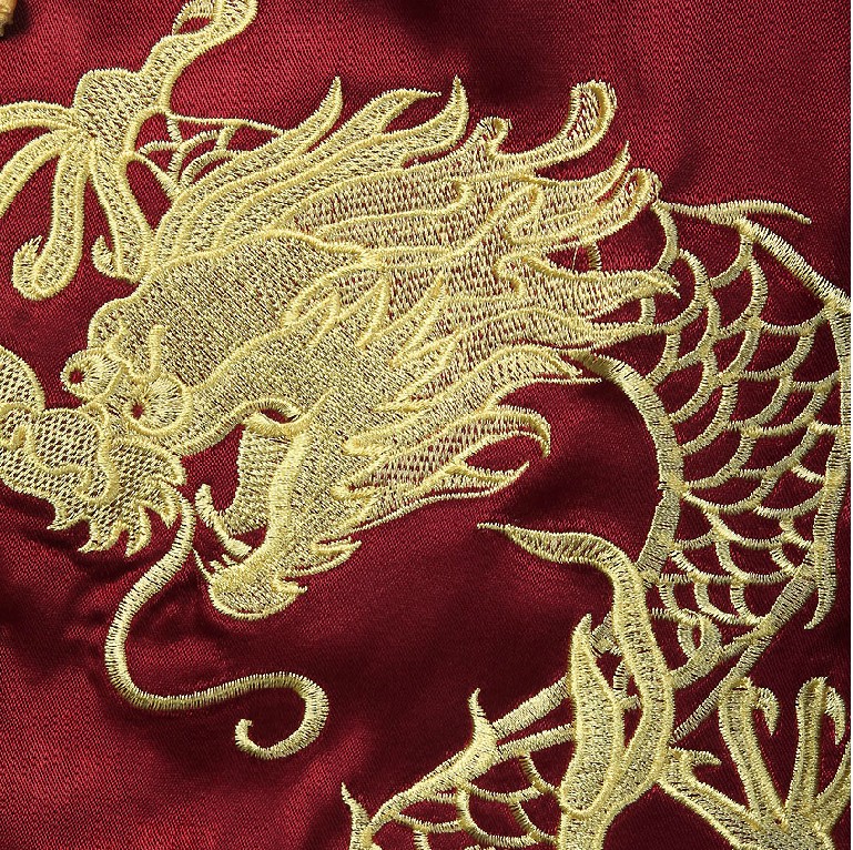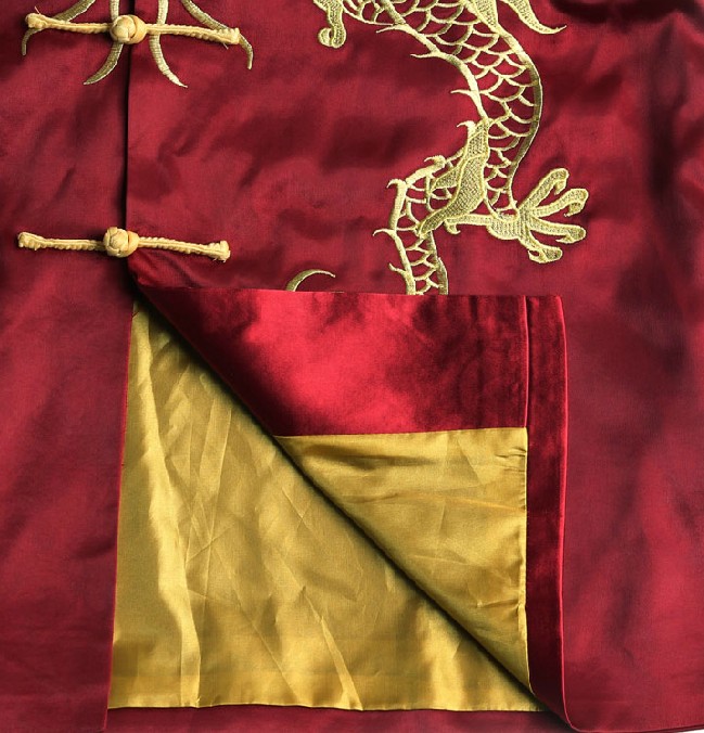 This exquisite men's Tang suit features a vibrant red silk-like fabric adorned with intricate gold dragon embroidery, symbolizing power and good fortune in Chinese culture. The jacket showcases a classic Mandarin collar and traditional frog buttons, finished with elegant wide gold cuffs for a regal appearance. Perfect for wedding grooms, Lunar New Year celebrations, or cultural performances, this traditional garment seamlessly blends heritage with formal style. Crafted for comfort and elegance, it is the ideal choice for honoring tradition during life's most significant milestones.