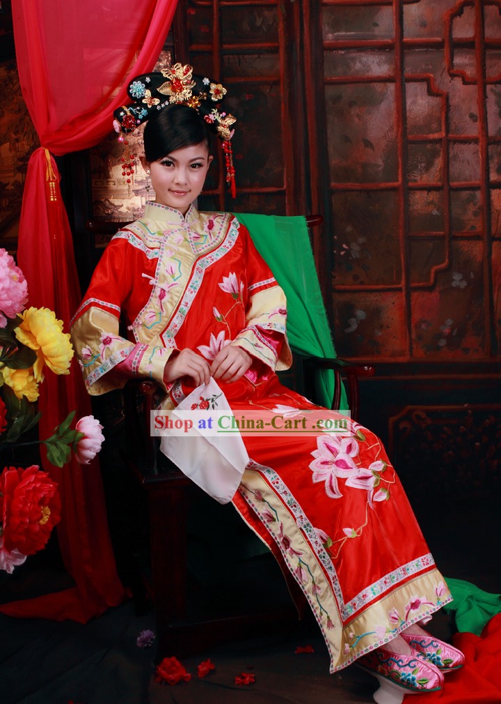 This exquisite red robe features intricate floral embroidery and gold trim, capturing the elegance of a Qing Dynasty noble lady. Crafted from high-quality satin fabric, this traditional Manchu costume offers a luxurious feel and a graceful drape perfect for stage performances. The ensemble is designed to be paired with the classic flag-head headdress, creating an authentic ancient palace aesthetic. Ideal for cultural festivals, historical reenactments, or traditional photography, this outfit allows you to experience the grandeur of imperial China.