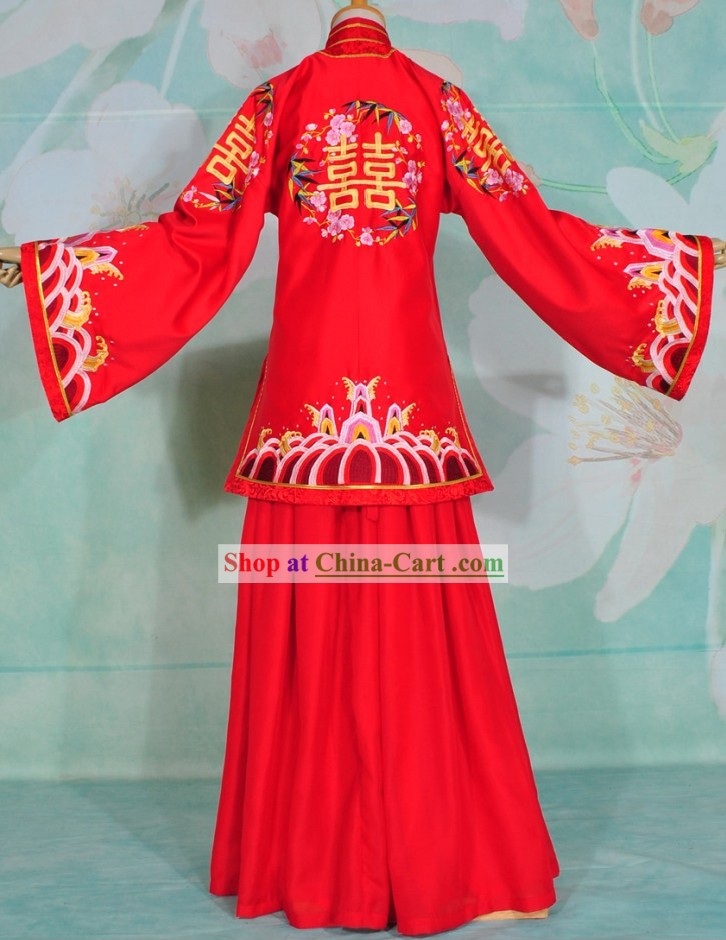 This exquisite traditional Chinese wedding dress, known as a Qun Kwa, features a vibrant red hue symbolizing luck and joy for the new couple. The jacket is adorned with intricate gold embroidery depicting auspicious phoenixes and the "Double Happiness" character, representing marital bliss and harmony. The matching floor-length skirt showcases elegant peony floral motifs, a symbol of wealth and honor, framed by gold piping. Crafted with a classic Mandarin collar and traditional frog buttons, this two-piece ensemble offers a dignified and timeless look perfect for tea ceremonies and wedding banquets.
