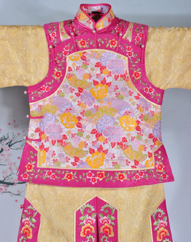 This exquisite traditional Chinese Xiuhe suit features a stunning combination of imperial gold brocade and vibrant pink accents. Intricate floral embroidery adorns the bodice and skirt panels, showcasing meticulous craftsmanship rooted in ancient Qing Dynasty aesthetics. Designed with wide sleeves and a mandarin collar, this luxurious garment offers a regal fit perfect for special occasions. Ideal for traditional weddings, cultural performances, or photography, it embodies the elegance and prosperity of Chinese heritage.