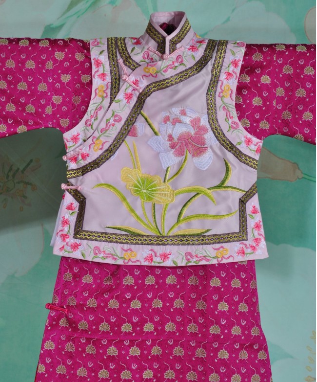 This exquisite traditional Chinese costume features a vibrant pink and teal color palette with intricate floral embroidery, capturing the elegance of the Qing Dynasty aesthetic. The ensemble includes a wide-sleeved top adorned with gold peacock feather patterns and a matching patterned skirt, crafted from smooth satin fabric for a luxurious drape and comfortable movement. Ideal for cultural performances, stage dances, or festive celebrations, this outfit allows wearers to embody the grace of ancient Chinese nobility. The detailed needlework showcases traditional motifs like blooming lotuses, symbolizing purity and beauty in Chinese culture.